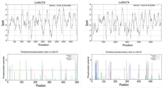 Hydrophobic cluster and signal peptide analysis of LoSUT2 and LoSUT4. The amino acid sequences were arranged horizontally. The hydrophobic site was located above the zero line, while the hydrophilic site was located below the zero line. The horizontal axis represents the amino acid, and the vertical axis represents the probability that the amino acid of that position was phosphorylated.