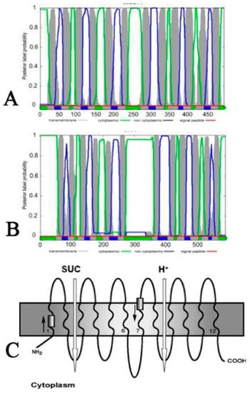 As a membrane protein, it is necessary to understand the transmembrane mechanism of LoSUT2 and LoSUT4. We used Phobius to predict the transmembrane structure of the protein (Figure 9). Both proteins were predicted to have 12 transmembrane regions, and it was concluded that all SUT genes belonged to a large population of sucrose carriers, and their typical characteristics were 12 transmembrane regions [,]. The transmembrane region was divided into two groups based on the middle of a circular region located in the cell. There were six transmembrane regions in each group. The N-terminal and C-terminal were all inside the cell, which was consistent with LoSUT2 and LoSUT4. It was also indicated that the SUT protein had a conserved histidine N in the first extracellular loop region, which was closely related to the transport activity of sucrose. In addition, in LoSUT2 it was also predicted that there was a histidine residue in the first extracellular loop region (44–62 sequence, SLLTPYVQELGIPHKWSS), and the same as LoSUT4 (76–94 sequence: LSLLTPYVQTLGIGHFFSS), which further supported both genes that belonged to the SUT family.