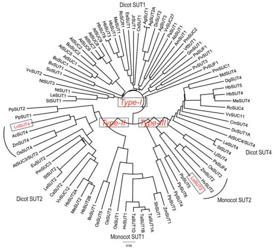 All SUT genes are broadly divided into three sorts. The gene of Type-I SUT contains the dicot transporter of the classical SUT1 of dicotyledonous plants, which is thought to play a role in the phloem loading. Type-II includes all SUT1 genes of monocotyledonous plants, such as OsSUT3,4,5 and genes of the SUT2 family of dicotyledonous plants. Among them, parts of the SUT2 family of genes are presumed to be sugar receptors. Type-III contains the majority of the SUT4 genes in the dicotyledons and part of the SUT2 gene in the monocotyledonous plants [].