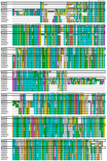 Comparison of the deduced amino acid sequence of LoSUT2 and LoSUT4 with its homologs. The black box represents the location of LoSUT genes. Amino acid residues of different kinds are shaded in different colors to show the similarity of the sequences.