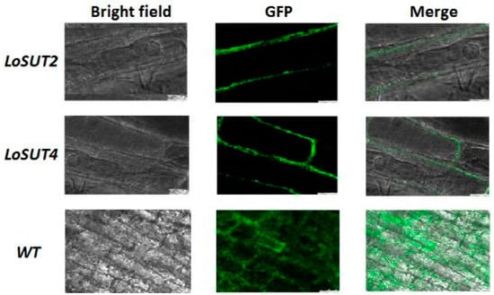 Subcellular localization of LoSUT2 and LoSUT4 in onion epidermis. SUT genes expressed the GFP-highlighted position of proteins.