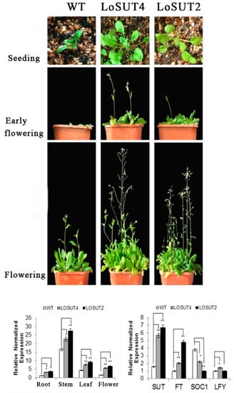 To explore the function of LoSUT in signaling, transgenic Arabidopsis thaliana plants overexpressing LoSUT2 and LoSUT4 were generated. It was found that Columbia wild-type was able to grow and breed normally with Agrobacterium tumefaciens containing LoSUT2 and LoSUT4 recombinants by the inflorescence dip method. After the resistance screening and PCR identification, the over-expressed LoSUT2 and LoSUT4 transgenic plants were obtained (Figure S1). In this study, wild-type (WT) plants and transgenic plants expressing LoSUT2 and LoSUT4 were cultured under the same conditions. The results displayed that the transgenic plants over-expressing LoSUT2 and LoSUT4 showed certain differences comparing with WT plants. By observing its phenotypic changes, it was found that transgenic plants over-expressing LoSUT2 and LoSUT4 flowered ahead of time compared with WT plants (Figure 14).