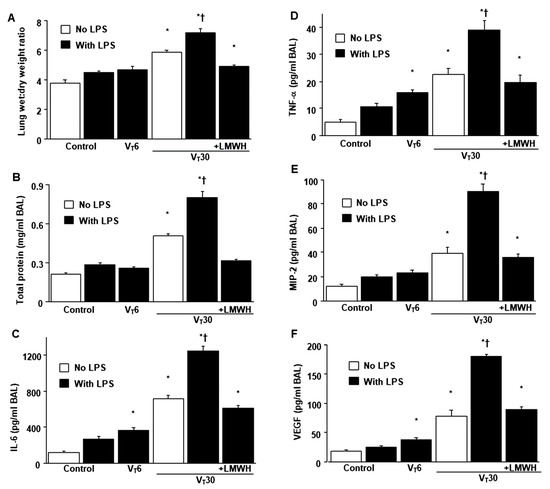 Inhibition of endotoxin-aggravated mechanical ventilation-enhanced lung injury by enoxaparin. (A) Lung wet-to-dry-weight ratio, (B) BAL fluid total protein, (C) IL-6, (D) TNF-α, (E) MIP-2 and (F) VEGF secretion in BAL fluid were from the lungs of nonventilated control mice and those subjected to a tidal volume of 6 or 30 mL/kg for 5 h with or without LPS administration (n = 5 per group). Enoxaparin, 4 mg/kg, was given subcutaneously 30 min before mechanical ventilation. * p < 0.05 versus the nonventilated control mice with LPS; † p < 0.05 versus all other groups. BAL = bronchoalveolar lavage; IL = interleukin; MIP-2 = macrophage inflammatory protein-2; TNF-α = tumor necrosis factor-α; VEGF = vascular endothelial growth factor.