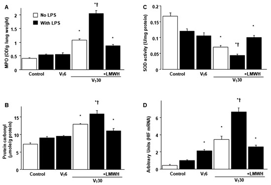 Reduction of endotoxin-exacerbated mechanical ventilation-mediated neutrophil influx, oxidative stress and HIF-1α mRNA expression by enoxaparin. (A) MPO activity, (B) protein carbonyl groups and (C) SOD from the same animals were from the lungs of nonventilated control mice and those subjected to a tidal volume of 6 or 30 mL/kg for 5 h with or without LPS administration (n = 5 per group). (D) Real-time polymerase chain reaction of HIF-1α mRNA expression was from the lungs of nonventilated control mice and those subjected to a tidal volume of 6 or 30 mL/kg for 5 h with or without LPS administration (n = 5 per group). Arbitrary units were expressed as the ratio of HIF-1α mRNA to GAPDH (n = 5 per group). Enoxaparin, 4 mg/kg, was given subcutaneously 30 min before mechanical ventilation. * p < 0.05 versus the nonventilated control mice with LPS treatment; † p < 0.05 versus all other groups. GAPDH = glyceraldehydes-phosphate dehydrogenase; MPO = myeloperoxidase; SOD = sodium dismutase.