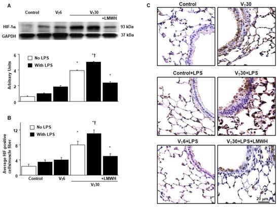 Abrogation of endotoxin-augmented mechanical ventilation-induced HIF-1α expression by enoxaparin. (A) Western blots from the same animals were conducted using antibodies that recognize HIF and GAPDH expression from the lungs of nonventilated control mice and mice ventilated at a tidal volume of 6 or 30 mL/kg for 5 h with or without LPS administration (n = 5 per group). Arbitrary units were expressed as the ratio of HIF-1α to GAPDH (n = 5 per group). (B,C) Representative micrographs (400×) with HIF-1α staining of paraffin lung sections and quantification were from nonventilated control mice and mice ventilated at a tidal volume of 6 or 30 mL/kg for 5 h with or without LPS administration (n = 5 per group). Enoxaparin, 4 mg/kg, was given subcutaneously 30 min before mechanical ventilation. Scale bars represent 20 μm. * p < 0.05 versus the nonventilated control mice with LPS; † p < 0.05 versus all other groups.