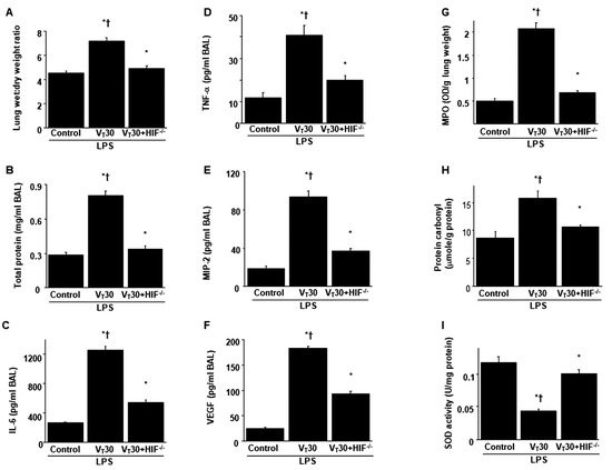 Inhibition of endotoxin-stimulated MV-induced lung injury in HIF-1α deficient mice. (A) Lung wet-to-dry-weight ratio, (B) BAL fluid total protein, (C) IL-6, (D) TNF-α, (E) MIP-2 and (F) VEGF secretion in BAL fluid, (G) MPO activity, (H) protein carbonyl groups and (I) SOD were from the lungs of nonventilated control mice and those subjected to a tidal volume of 30 mL/kg for 5 h with LPS administration (n = 5 per group). * p < 0.05 versus the nonventilated control mice with LPS; † p < 0.05 versus HIF-1α-deficient mice. HIF−/− = hypoxia inducible factor-1α-deficient mice.