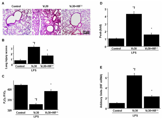 Reduction of endotoxin-aggravated mechanical ventilation-mediated lung damage, hypoxemia, impaired respiratory function and HIF-1α mRNA expression by HIF-1α homozygous knockout. (A) Histological examination (100×), (B) lung injury scores, (C) PaO2/FiO2, (D) enhanced pause and (E) HIF-1α mRNA expression were from the lungs of nonventilated control mice and those subjected to a tidal volume of 30 mL/kg for 5 h with or without LPS administration (n = 5 per group). (D) Real-time polymerase chain reaction of HIF-1α mRNA expression was from the lungs of nonventilated control mice and those subjected to tidal volume at 6 or 30 mL/kg for 5 h with LPS administration (n = 5 per group). Arbitrary units were expressed as the ratio of HIF-1α mRNA to GAPDH (n = 5 per group). Scale bars represent 20 μm. * p < 0.05 versus the nonventilated control mice with LPS treatment; † p < 0.05 versus HIF-1α-deficient mice.