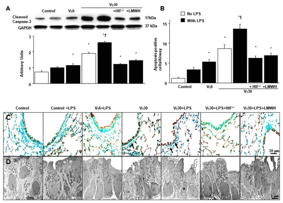 HIF-1α homozygous knockout and enoxaparin ameliorated endotoxin-augmented mechanical ventilation-induced caspase-3 expression and epithelial apoptosis. (A) Western blots from the same animals were conducted using antibodies that recognize caspase-3 and GAPDH expression from the lungs of nonventilated control mice and mice ventilated at a tidal volume of 6 or 30 mL/kg for 5 h with or without LPS administration (n = 5 per group). Arbitrary units were expressed as the ratio of cleaved caspase-3 to GAPDH (n = 5 per group). (B–D) Representative micrographs with TUNEL staining of paraffin lung sections and quantitation (B,C, 400×) (n = 5 per group) and transmission electron microscopic image (D, 10,000×) (n = 3 per group) were from the nonventilated control mice and those subjected to a tidal volume of 6 or 30 mL/kg for 5 h with or without LPS administration. A dark-brown diaminobenzidine signal indicated positive staining of apoptotic cells, whereas shades of blue–green to greenish tan signified nonreactive cells. Highly condensed and fragmented heterochromatin of epithelial cells indicates apoptosis. Apoptotic cells are identified by asterisks or arrows. Enoxaparin, 4 mg/kg, was given subcutaneously 30 min before mechanical ventilation. * p < 0.05 versus the nonventilated control mice with LPS; † p < 0.05 versus all other groups. Scale bars represent 20 μm (TUNEL) or 1 μm (TEM). TEM = transmission electron microscopy; TUNEL = terminal deoxynucleotidyl transferase-mediated dUTP-biotin nick end-labeling.