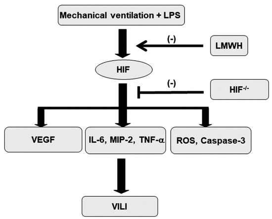 Sepsis is the leading cause of admission to intensive care units (ICUs) and results in a hospital mortality rate as high as 30%. During the course of sepsis, infectious components, such as lipopolysaccharide (LPS), may induce an inflammatory cascade causing the release of inflammatory cytokines interleukin (IL)-6, macrophage inflammatory protein-2 (MIP-2), tumor necrosis factor (TNF)-α and vascular endothelial growth factor (VEGF), which can engender microvascular leakage, lung edema, epithelial and endothelial injury and hypoxemia. This can lead to multiple organ failure [1,2,3]. Mechanical ventilation (MV) is often used to maintain the life of patients with sepsis-related acute lung injury (ALI). However, prolonged MV may increase the risk of pathologic overdistention in the lungs, increase the production of inflammatory cytokines, recruit inflammatory cells, and eventually induce a type of ALI, termed ventilator-induced lung injury (VILI) [4]. Accumulating evidence has revealed that mechanically ventilating patients is associated with lung inflammation, increased oxidative stress and lung tissue hypoxia, which may contribute to difficulty in ventilator weaning and complications such as ventilator-associated pneumonia, sepsis, and increased mortality [1,2,3,4]. However, the mechanisms regulating the interactions between sepsis, MV, and these inflammatory reactions remain unclear.