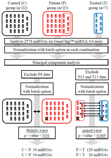 The signal was normalized by the RMA method using the Transcriptome Analysis Console (ver. 4.0, Thermo Fisher Scientific, Waltham, MA, USA). For statistical analysis and principal component analysis, the JMP® program (ver. 14, SAS Institute Inc., Cary, NC, USA) was used. Welch’s test (p < 0.01) was used to detect miRNAs differentially expressed between the C- and P-groups after normalization without P8 data (Figure 1, left flow). A paired t-test (p < 0.005) was used to detect miRNAs differentially expressed between the P- and T-groups after the normalization without P13 and T13 data (Figure 1, right flow). Normalization of the array signal was performed considering batch differences (Batch option on the Transcriptome Analysis Console). The constituents of each batch were as follows: Batch170803 (C11, C16, C27, P1, P3, and P4), Batch 170830 (C9, C10, C14, P5, and P7), Batch170908 (C1, C5, P9, and P11), Batch171005 (C13, C22, C23, P6, P13, and P14), Batch171018(C2, C3, C4, C12, C18, P2, P10, and P12), Batch180403 (C6, C20, C24, C25, P16, P17, P18, and P20), Batch180410 (C7, C17, P24, P25, and P27), and Batch180413 (P22 and P23). All samples in the T-group were of the same batch. For principal component analysis, data were normalized with the Batch option in the combination indicated by each plot (Figure 2a,b). Same data were subjected to statistical tests to detect differentially expressed miRNAs among the experimental groups (Welch’s t-test for C- vs. P-groups, paired t-test for P- vs. T-groups; Figure 1). Student’s t-test (p < 0.0005) was used to examine the difference in miRNA expression levels between subjects with and without hypertension. In this case, miRNA expression levels were normalized within the C- and P-groups, respectively. The cluster dendrogram with heat-mapping was drawn by JMP (https://www.jmp.com/ja_jp/offers/statistical-analysis-software.html) from the data presented in Figure 2a.