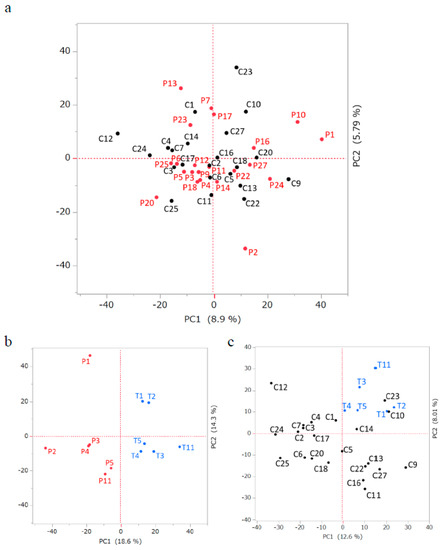 Principal component analysis of miRNA expression levels in each group comparison after exclusion of outlier data. The X and Y axes represent the first and the second principal components with contribution ratios in percentages. Control and patient groups (a), patient and treated group (b), and control and treated groups (c). “C”, “P”, or “T” with numbers indicate the samples in each group.
