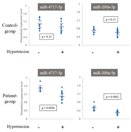 Dependence of miRNA expression levels on presence of hypertension. Expression levels of miRNAs were compared between subjects with hypertension and those without. The expression levels were normalized within each group. Significant differences (t-test, p < 0.01) were detected only in the P-group.