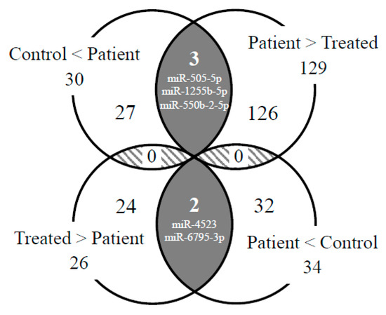 Venn diagram illustrating inclusion relationships of the detected miRNA sets. The numbers indicate the detected miRNAs. The numbers in the gray and hatched zones indicate miRNAs detected in both the control/patient and in the patient/treated comparisons.