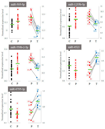 The expression levels of five common miRNAs within each experimental comparison. C and P: control group vs. patient group; P and T: patient group vs. treated group. The expression levels in the P-group were differentially represented due to differences in the normalization processes (Section 4).