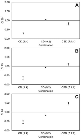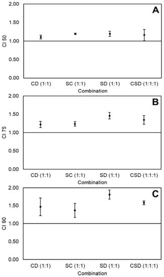 - Chou, T.C. Theoretical basis, experimental design, and computerized simulation of synergism and antagonism in drug combination studies. Pharmacol. Rev. 2006, 58, 621–681. [Google Scholar] [CrossRef]