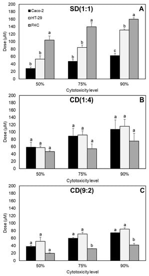 | CD(1:1) | 8.8 ± 2.2e | 35.3 ± 8.8cde | 17.2 ± 3.6de | 68.7 ± 14.5bc | 33.5 ± 5.8de | 134.0 ± 23.2bc | |||