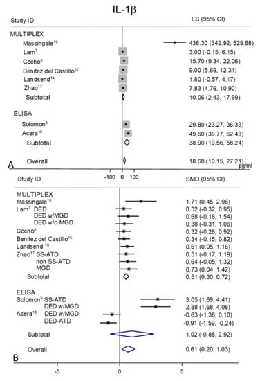 Meta-analysis of tear IL-1β levels: (A) mean values and 95% CI of control subjects; (B) standardized mean difference (SMD) of DED patients vs. control subjects. ES = effect size. DED = dry eye disease; SS = Sjogren’s syndrome; non SS = non Sjogren’s syndrome; ATD = aqueous tear deficiency; MGD = meibomian gland dysfunction.