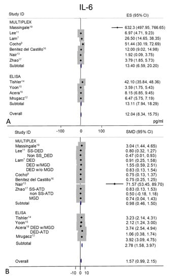 Meta-analysis of tear IL-6 levels: (A) mean values and 95% CI of control subjects; (B) standardized mean difference (SMD) of DED patients vs. control subjects. ES = effect size. DED = dry eye disease; SS = Sjogren’s syndrome; non SS = non Sjogren’s syndrome; ATD = aqueous tear deficiency; MGD = meibomian gland dysfunction.