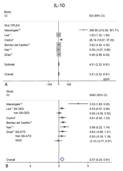 Meta-analysis of tear IL-10 levels: (A) mean values and 95% CI of control subjects; (B) standardized mean difference (SMD) of DED patients vs. control subjects. ES = effect size. DED = dry eye disease; SS = Sjogren’s syndrome; non SS = non Sjogren’s syndrome; ATD = aqueous tear deficiency; MGD = meibomian gland dysfunction.
