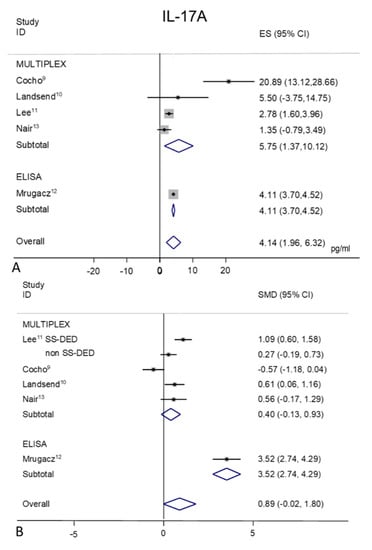 Meta-analysis of tear IL-17A levels: (A) mean values and 95% CI of control subjects; (B) standardized mean difference (SMD) of DED patients vs. control subjects. ES = effect size; DED = dry eye disease; SS = Sjogren’s syndrome; non SS = non Sjogren’s syndrome.