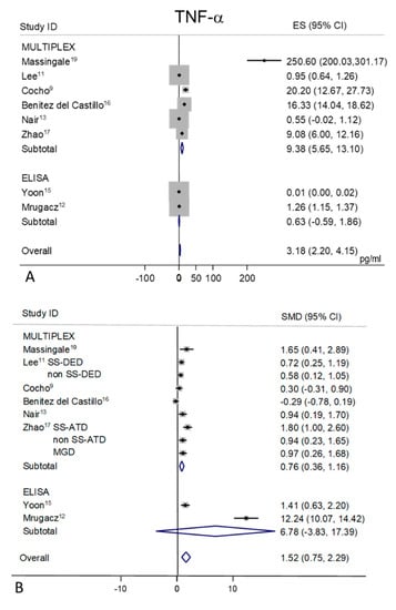 Meta-analysis of tear TNF-α levels: (A) mean values and 95% CI of control subjects; (B) standardized mean difference (SMD) of DED patients vs. control subjects. ES = effect size; DED = dry eye disease; SS = Sjogren’s syndrome; non SS = non Sjogren’s syndrome; ATD = aqueous tear deficiency; MGD = meibomian gland dysfunction.