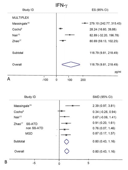 Meta-analysis of tear IFN-γ levels: (A) mean values and 95% CI of control subjects; (B) standardized mean difference (SMD) of DED patients vs. control subjects. ES = effect size; DED = dry eye disease; SS = Sjogren’s syndrome; non SS = non Sjogren’s syndrome; ATD = aqueous tear deficiency; MGD = meibomian gland dysfunction.