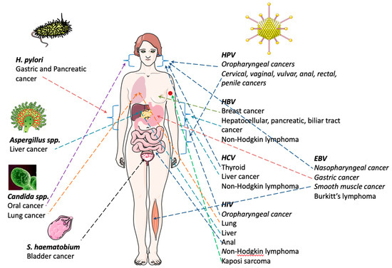 Human microbiome disruption is associated with different types of cancer, including gastric, colorectal, pancreatic and breast cancer. Moreover, the human body can be infected by innumerable environmental microorganisms, and cancers could be induced by bacteria, virus and fungi. In particular, human oncoviruses can drive carcinogenesis by integrating oncogenes into the host genome.