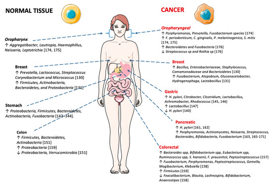 As stated above, cancer can be associated with the specific microbial environment in the tissue of origin. A recent study reported that the microbiome found in breast tissue varies between women with and without breast cancer [130] (Figure 2). The researchers detected higher levels of Bacillus, Enterobacteriaceae, Staphylococcus, Comamonadaceae and Bacterioidetes in women cancer samples and, in contrast, healthy breast tissue revealed higher levels of Prevotella, Lactococcus, Streptococcus Corynebacterium and Micrococcus species [130]. A study conducted by Hieken and collaborators [131] detected high levels of phyla Firmicutes, Actinobacteria, Bacteroidetes, and Proteobacteria in healthy breast tissues, compared to breast cancer tissues where a lower abundance of Fusobacterium, Atopobium, Gluconacetobacter, Hydrogenophaga and Lactobacillus genera were found. Another study on breast cancer also showed distinct microbial communities between normal and cancer breast tissues. The malignancy is associated with enrichment in the genera Fusobacterium, Atopobium, Gluconacetobacter, Hydrogenophaga and Lactobacillus [131].