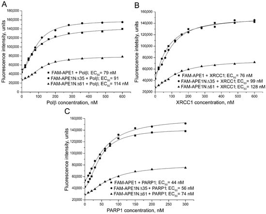 | FAM-APE1NΔ35 | gap-DNA | PARP1 | 48 ± 4 | 0.84 | +0.03 |