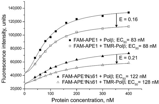 | Labelled Protein a | DNA a | Protein Partner | EC50 b, nM | Effect on Affinity c | Effect on FRET Efficiency d |