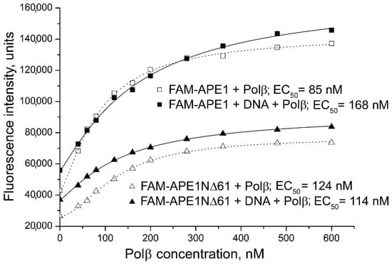 | FAM-APE1NΔ61 | Polβ | 120 ± 11 ** | 1.4 | 0.22 ± 0.02 * |