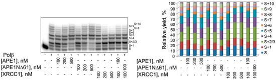 - Sukhanova, M.V.; Khodyreva, S.N.; Lebedeva, N.A.; Prasad, R.; Wilson, S.H.; Lavrik, O.I. Human base excision repair enzymes apurinic/apyrimidinic endonuclease1 (APE1), DNA polymerase β and poly(ADP-ribose) polymerase 1: interplay between strand-displacement DNA synthesis and proofreading exonuclease activity. Nucleic Acids Res. 2005, 33, 1222–1229. [Google Scholar] [CrossRef]