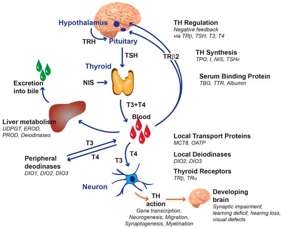 THs play essential roles in growth and development by controlling cell differentiation, migration and homeostasis. Hormone synthesis is regulated by the hypothalamic–pituitary–thyroid axis. Effective tissue levels of THs are controlled through multiple layers of regulation including deiodinations in peripheral tissues, specific cell membrane transporters, binding to distributor proteins, the removal of TH by sulfation or glucuronidation in the liver, or the modulation of iodide uptake into the thyroid (Figure 1) []. All these mechanisms influence the availability of THs in the receptors inside target cells. This complex regulatory system can be disrupted at multiple levels—for example, by chemicals that suppress TH synthesis, interfere with the uptake of iodide into the thyroid gland, block the transfer of THs across physiological barriers or stimulate the clearance of THs in the liver [].
