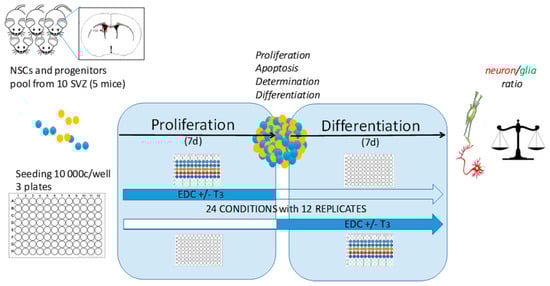 Protocol for developing neurospheres from two-month-old mice. Neurospheres prepared from the subventricular zone (SVZ) of five mice are obtained after 7 days of proliferation in the presence of growth factors. Without growth factors, neurosphere dissociated cells are allowed to differentiate into neuronal or glial cells. Thyroid hormones tightly influence this balance by promoting the neuronal fate at the expense of the glial fate. Note that thyroid hormone (TH) antagonists induce the opposite phenotype.