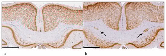 Heterotopia—misplaced cells in the corpus callosum of rats. Panel (a), left, shows the appearance of the corpus callosum in a control rat. Panel (b), right, shows heterotopia in the corpus callosum of a rat exposed in foetal life and postnatally to propylthiouracil (maternal dose: 2.5 mg/kg d). The arrows point to the misplaced cells. Scale bars: 1 cm.