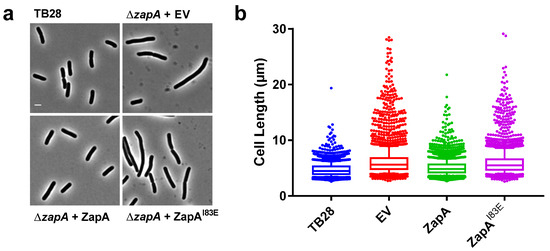 ZapAI83E does not complement the elongated ∆zapA phenotype. (a) Phenotypes of the cells. The scale bar represents 2 µm. (b) Cell length distributions of each group. The number of cells and their average length measured were for the wild-type parental strains TB28; 3670 and 4.5 μm, EV; 2686 and 6.4 μm, from plasmid-expressed ZapAWT; 4476 and 5.1 μm and ZapAI83E; 2491 and 6.1 μm, respectively. The whiskers represent the 10th and 90th percentile.