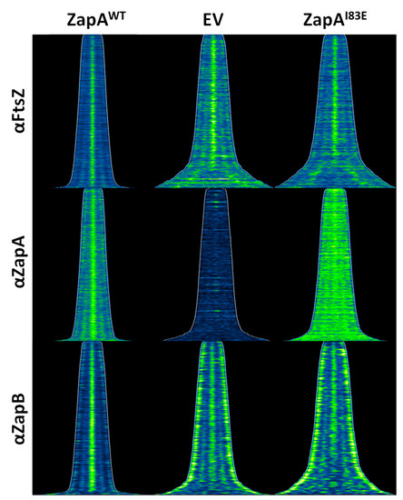 ZapAI83E mainly localizes throughout the cytoplasm and does not complement ∆zapA cells based on the loss of specific Z-associated protein B (ZapB) localization. Maps of fluorescence profiles of TB28 ∆zapA cells expressing wild-type Z-associated protein A (ZapA), an empty vector control (EV) or ZapAI83E immunolabeled with antibodies against filamenting temperature-sensitive Z (FtsZ), ZapA, or ZapB. Cells are sorted according to cell length using ObjectJ [17] and the fluorescence intensities of each labeling is shown at identical brightness and contrast values for direct comparison. Images of immunolabeled cells and average profiles along the cell cycle are presented in Figure S1.