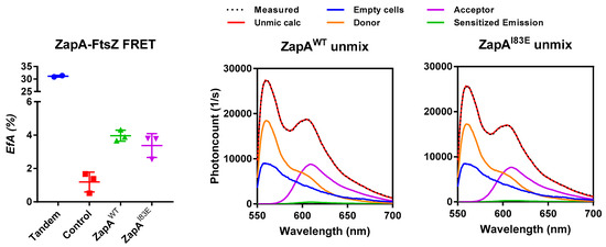 FtsZ and ZapAI83E in vivo interaction FRET assay. On the left, the energy transfer efficiency of the FRET interactions indicated in the text. The positive and negative controls suggest a reliable experiment. On the right, typical emission spectra plotted against the photoncounts for the mCh–ZapA and mKO–FtsZ pairs. The contribution of the direct excitation of mCh (purple), mKO (orange), and the background autofluorescence (blue) to the measured spectrum (dotted line) were obtained by spectral unmixing [19,20]. The remaining signal (green) is the sensitized emission. mCh–ZapAWT and mCh–ZapAI83E showed similar fluorescence spectra with mKO–FtsZ resulting in similar EfA values.