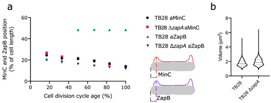 MinC localization was identical in TB28 and ∆zapA despite the polar presence of ZapB in the latter strain. (a) The distance from the ZapB containing cell pole to the position of MinC in that cell pole was determined in TB28 ∆zapA and compared with the position of MinC in wild-type cells and plotted against the normalized cell division cycle age (see also cartoon). The position of ZapB in the pole with the strongest ZapB signal in TB28 ∆zapA was also plotted and compared to its position in the wild-type strain. In the wild-type strain, all ZapB molecules ended up at midcell, whereas in the ∆zapA strain only a minor amount was present at midcell (see Figure S5 for complete profiles). (b) Volume distribution of TB28 and TB28 ∆zapA cells. The number of cells analyzed for TB28 a(anti)MinC, TB28 ∆zapA aMinC, TB28 aZapB, and TB28 ∆zapA aZapB were 3201, 4154, 3473, and 1726, respectively.
