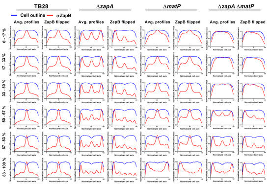 Both ZapB and MatP are required to bring matS sites (and thus ter) to the division site [22]. If the physical interaction of ZapB and MatP is required for the correct localization of the chromosomes, changes in ZapB dynamics are expected in a ∆matP strain. Strain TB28 and ∆zapA, ∆matP, or ∆zapA ∆matP in an isogenic background were grown under rich medium conditions before they were fixed, harvested, and labeled with antiZapB. The fluorescence profiles were analyzed using ObjectJ (Figure 6). As expected, ZapB localized at midcell in the wild-type cells and mainly (uni)polar in the ∆zapA cells. In the absence of MatP, ZapB was still able to be recruited to midcell but also partly localized to the poles and in the cells’ periphery. The ZapB localization signals were substantially stronger in cells without MatP suggesting either more ZapB production by the cells or that more ZapB epitope became available to antiZapB. The double-deletion strain showed the combined effects of the single zapA or matP deletions. In these cells, ZapB localized mainly polar but also more throughout the cell. These results support the idea that both ZapA and MatP influence the localization of ZapB. In such a model ZapA has a role in guiding ZapB to midcell and MatP helps in keeping ZapB from freely distributing throughout the cell.