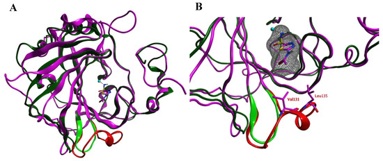(A) The overlay of the hCA IX (purple and red) and PpCA (dark and light green) structures. The carbonic anhydrase enzymes (CA) inhibitor acetazolamide (purple) that is cocrystallized in the hCA IX structure is shown. (B) A zoom-in of the active sites of both enzymes reveals that the hCA IX loop (Ser124–Gly140; red) is larger compared to the PcCA loop (green) and approaches the cocrystallized ligand. The ligand surface is indicated in a grey mesh.