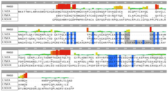 Sequence alignment of VcCA (UniProt: A0A0X1L2C8), PpCA (pdb: 5hpj) and hCA IX (pdb: 3iai). The residues indicated in blue belong to the binding pocket (within 4.5 Å of azm). The residues indicated in grey are part of the different folded loop near the pocket (Ser124–Gly140; hCA IX numbering). The RMSD per residue between PpCA and hCA IX is shown.