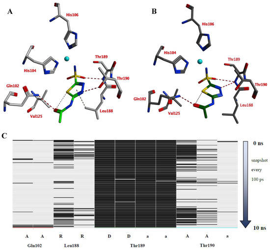 A 10 ns MD simulation was performed on the newly constructed VcCA homology model in complex with azm (Figure 3). The intermolecular interactions between the enzyme active site and azm were analyzed using the protein–ligand interaction fingerprint (PLIF) tool of MOE (v2019.01.02, Chemical Computing Group Inc., Montreal, Quebec, Canada). The main observed interactions during the simulation (represented as 100 snapshots; one snapshot per 100 ps) were with Gln102 (“A”: side chain acceptor interaction), Leu188 (“R”: H-Arene interaction), Thr189 (“D”: side chain donor interaction, “a”: backbone acceptor interaction), and Thr190 (“A”, “a”). The interactions of azm with the binding pocket of the VcCA model remained stable during the simulation, especially between the ligand’s sulfonamide group and the sidechain of Thr189 and Zn2+ (all snapshots). The hydrogen bond between azm and the sidechain of Thr190 was observed in 48% of the snapshots. The H–arene interaction between the ligand and the sidechain of Leu188 was observed in 37% of the snapshots. The hydrogen bond with the sidechain of Gln102 was only observed in 6% of the frames, including the first (0 ns) and the last (10 ns). The calculated average binding energy between azm and VcCA was 57.3 kJ/mol (Figure 3D).