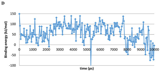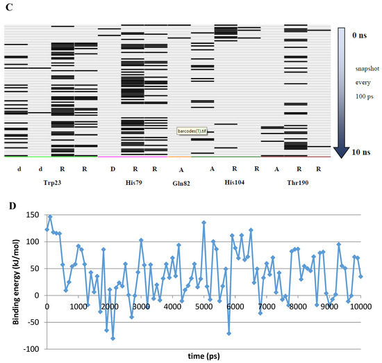(A) The VcCA-azm model (t = 0 ns). (B) The VcCA-azm model after a 10 ns MD simulation. (C) The protein–ligand interaction fingerprint (PLIF) showing the interaction of azm with the VcCA binding pocket residues during the simulation as barcodes (a black line indicating the presence of the interaction at snapshot). (D) The binding energy (kJ/mol) between azm and VcCA. Hydrogen bonds are indicated in red dashed lines. H–arene interactions are indicated in yellow dashed lines. “A” indicates sidechain acceptor interactions, “a” indicates backbone acceptor interactions, “D” indicates side chain donor interactions, and “R” indicates H–arene interactions. Two interactions of the same type per residue (for example “A” for Gln102) indicates that multiple interactions of the specified type between ligand and residue are formed. The arrow indicates the sequence of snapshots of every 100 ps from 0 to 10 ns.
