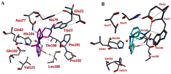 Compounds of series 4–24 have been docked into the active site of the VcCA homology model. All ligand sulfonamides interacted with the active site Zn2+ ion as required by our docking protocol. As such, the common 3-phenyl-1H-indole-5-sulfonamide moiety of all compounds interacted in a similar way with the VcCA active site. The phenyl group may form hydrogen–arene interactions with the side chains of Asn77 and Thr190 (Figure 4A). Compound 23, which has the top-ranked docking score, shows a hydrogen bond with the sidechain of Gln82. The aliphatic ring forms hydrophobic interactions with the sidechains of Trp23 and His79. The linker between the aliphatic ring and the indole ring has an extended flat conformation. The indole NH group and the cationic N atom of the aliphatic ring are solvent exposed and most likely could form hydrogen bonds with water.
