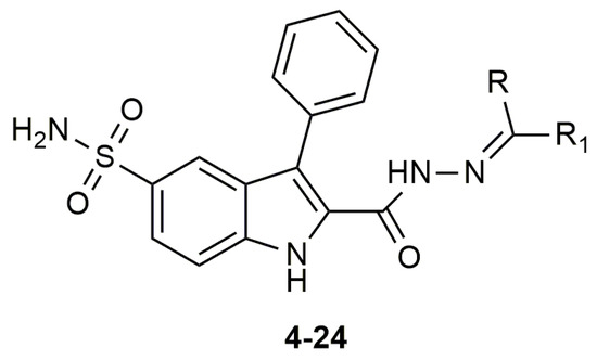 As an alternative drug target, three main classes of carbonic anhydrase enzymes (CA) from Vibrio cholerae, α, β, and γ were investigated for their potential for new antimicrobial drugs [20,21,22,23,24,25,26,27,28,29]. α-CA from Vibrio cholerae (VcCA), like all other carbonic anhydrase families (α-, β-, γ-, δ-, ζ-, η-, θ-, and ι-CAs), catalyzes the reversible conversion of carbon dioxide to a bicarbonate ion and a proton, and play an important role for the homeostasis and the virulence of Vibrio cholerae [30,31,32]. This Gram-negative bacterium colonizes the upper small intestine, where the amount of the sodium bicarbonate is at a high concentration. Bicarbonate is a potential inducer of virulence gene expression. If there are not enough transporter proteins, V. cholerae can increase cytosolic bicarbonate levels through the action of VcCA. Therefore, survival and virulence of this pathogen seems to be related to the utilization of the CA system [22,33]. Thus, inhibition of VcCA with selective carbonic anhydrase inhibitors offers a new aspect for cholera treatment. In our previous work, a new series of 2-(hydrazinocarbonyl)-3-phenyl-1H-indole-5-sulfonamide based hydrazones were synthesized and tested for their inhibitory profiles against tumor-related human carbonic anhydrase isozymes hCA IX/XII and against widely distributed off-targeted isoforms hCA I/II. In enzyme inhibition assays, these new molecules showed good inhibitory activity in the low nanomolar range and expressed selectivity over hCA I/II [34]. In this study, we first suggest that these compounds are potential inhibitors of VcCA with docking and molecular dynamics simulations. Subsequently, VcCA enzyme inhibition assays were performed to verify these compounds as novel inhibitors of VcCA, with selectivity over the widely distributed hCA I and II enzymes. These compounds may be used as leads in the search of new potent antimicrobial compounds for cholera treatment.