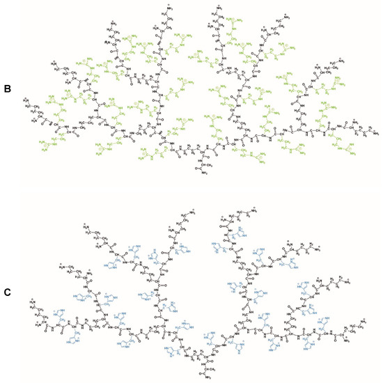 Chemical structures of D3K2 (A), D3R2 (B), and D3H2 (C) dendrimers. The backbone, identical for all dendrimers, is marked in black. The side groups of spacers between each pair of neighboring branching points are marked in red (lysine), green (arginine), and blue (histidine).