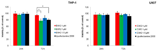 The effect of dendriplexes on the viability of THP-1 and U937 cell lines, presented as a percentage of untreated control (average ± SD, n = 3). The dendrimer:siRNA molar ratios equaled 20:1 (D3K2, D3R2) and 30:1 (D3H2). * Statistically significant difference at p < 0.05.