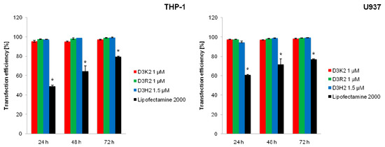 Efficiency of cellular uptake of siRNA-FITC by THP-1 and U937 cells (average ± SD, n = 3). The dendrimer:siRNA molar ratios equaled 20:1 (D3K2, D3R2) and 30:1 (D3H2). * Statistically significant difference between dendriplexes and Lipofectamine 2000:siRNA complex at p < 0.05.