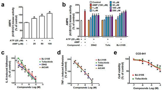 AMPK is known to regulate multiple signaling pathways, including JAK/STAT, and in a previous study, BJ-3105 was found to inhibit the cytokine-induced JAK/STAT signaling pathway in T cells [28], suggesting the action of BJ-3105 is associated with AMPK activity. A cell-free kinase assay system was used to examine the ability of BJ-3105 to activate AMPK. As in metabolic stress conditions that lack ATP, AMPK is activated by an increasing concentration of AMP at a fixed concentration (25 μM) of ATP (Figure 1a). In the condition that only the fixed concentration of ATP without AMP was provided, the BJ-3105 concentration dependently (10–250 μM) increased AMPK activity (Figure 1b). D942 (an indirect AMPK activator) induced a slight increase in AMPK activity without showing concentration dependency, and this was similar to that observed for tofacitinib (Figure 1b). Next, BJ-3105 was evaluated for its inhibitory effect on TNF-α- and on IL-6-induced monocyte adhesion to HT-29 colonic epithelial cells, which is indicative of the early phase of colon inflammation and has been used to screen anti-IBD compounds [29,30]. Although BJ-3105 concentration dependently inhibited IL-6-induced monocyte-HT-29 cell adhesion, its inhibitory pattern differed from that of tofacitinib (Figure 1c). At concentrations lower than 1 μM, the inhibitory activity of tofacitinib was weaker than those of the other three drugs (AICAR, D942, and BJ-3105), whereas at concentrations > 1 μM, tofacitinib was a little bit better than the other inhibitors. In terms of TNF-α-induced adhesion of monocytes to HT-29 cells, the BJ-3105 concentration dependently inhibited adhesion at a level similar to those of tofacitinib, D942, and AICAR (Figure 1d). BJ-3105 was not toxic to CCD-841, a human normal colon epithelial cell line, and the IC50 concentration that inhibited cell viability by 50% was greater than 100 μM, similar to tofacitinib (Figure 1e).
